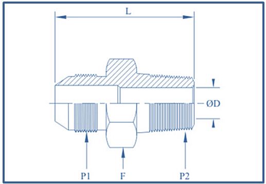 Common sizes are 1/8″ NPT X 7/16″ JIC, 1/4″ NPT X 1/2″ JIC, 3/8″ NPT X 3/4″ JIC, 1/2″ NPT X 3/4″ JIC,